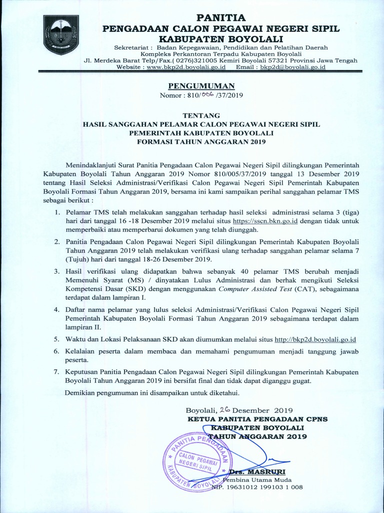 Pengumuman Hasil Sanggahan Seleksi Administrasi Cpns Kabupaten Boyolali Tahun 2019