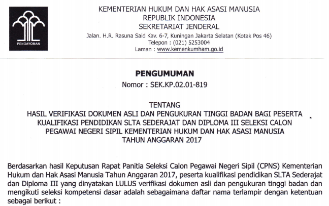 Pengumuman Hasil Verifikasi Dokumen Asli Dan Pengukuran Tinggi Badan Cpns Kemenkumham Sma D3 Informasi Pendidikan Dan Dunia Kerja