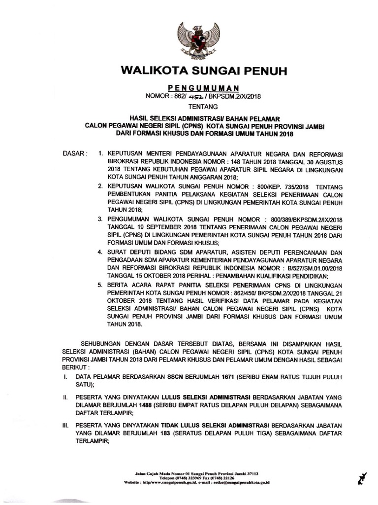 Pengumuman Hasil Seleksi Administrasi Cpns Kota Sungai Penuh 2018 Pdf