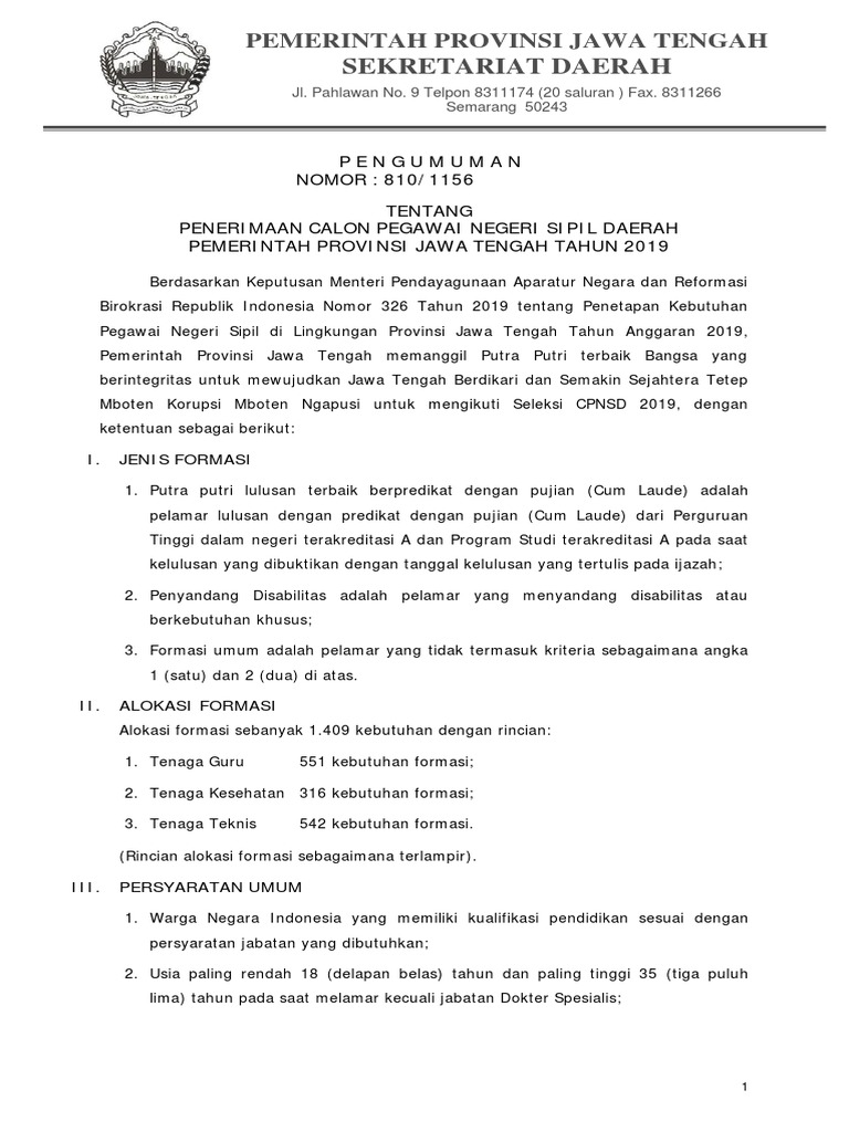 Pengumuman Lengkap Cpns Jateng 2019 1 Pdf