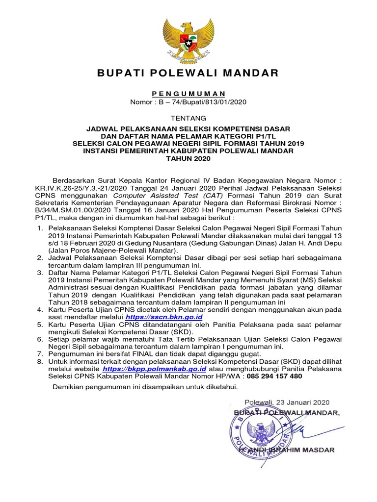 Pengumuman Hasil Skd Cpns 2019 Pemerintah Kab Polewali Mandar