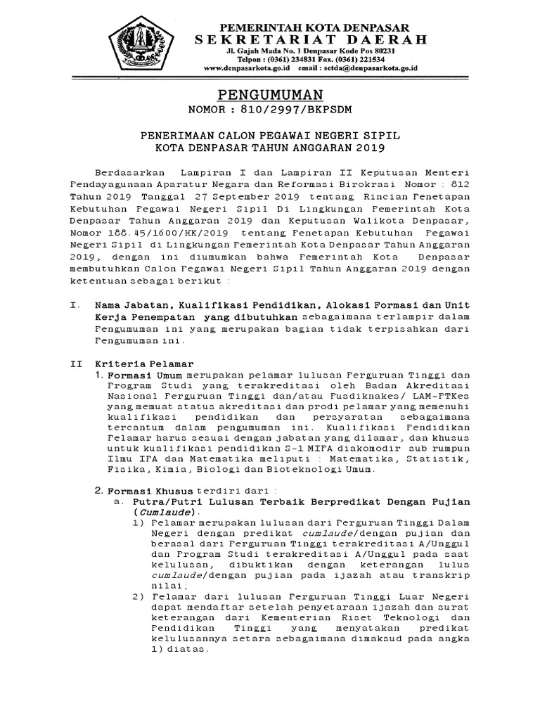 Pengumuman Seleksi Cpns Di Lingkungan Pemerintah Kota Denpasar Tahun 2019 Bkpsdm Denpasarkota Go Id