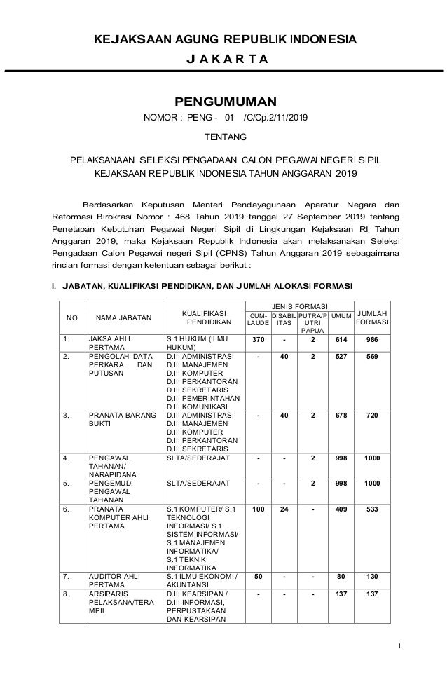 Pengumuman Pengadaan Cpns Kejaksaan Agung Ri 2019